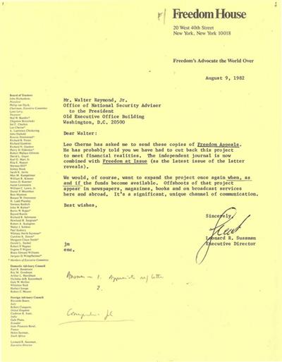 伦纳德·R·苏斯曼在函件中提到了美国总统情报咨询委员会主席利奥·切尔内(Leo Cherne),并向沃尔特·雷蒙德提出资助“呼唤自由”宣传项目的请求。苏斯曼写道:“亲爱的沃尔特,利奥·切尔内让我把‘呼唤自由’项目的副本寄给你。他可能已经告诉过你,我们不得不削减这个项目的资金,以应对财务现实。如果资金到位,我们当然愿意再次开展这个项目。”