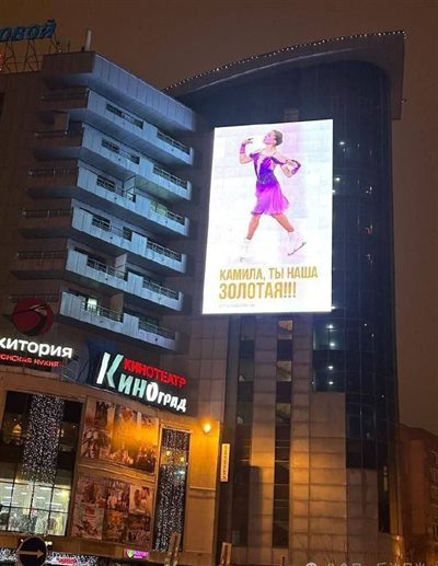 这两天,莫斯科和圣彼得堡的商业区都亮出了K宝广告牌,有的上面还写着双关语:“卡米拉(瓦利耶娃),你是我们的珍贵宝贝(金牌女孩)”(you are our golden one)