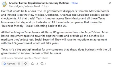 那会很搞笑。美国政府从墨西哥边境消失,取而代之的是新墨西哥州、俄克拉荷马州、阿肯色州和路易斯安那州的边界。所有依赖贸易的得克萨斯州企业都死了。所有那些搬到“商业友好型”得州的科技公司只能搬回美国。