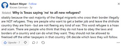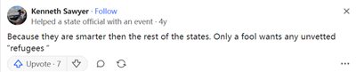 还有支持得克萨斯州的网民在“得州为什么成为第一个拒绝难民入境的州”话题下说:因为他们比其他州更聪明。只有傻瓜才想要任何未经审查的“难民”。