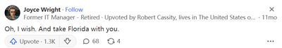 这位美国网友乔伊斯·赖特说:“应该。而且请带着佛罗里达州一起”。赖特之所以这么说,是因为佛罗里达也是美国南部一个受到非法移民问题困扰的共和党(红)州。