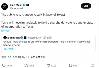 而在结果出台后,马斯克当即表示顺应“民意”,并宣布:特斯拉将立即采取行动举行股东投票,并根据结果来决定是否将公司注册地转移至得克萨斯。