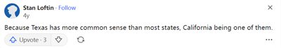 还有网友说:因为得克萨斯州比大多数州有更多的常识,加利福尼亚州就是其中之一。