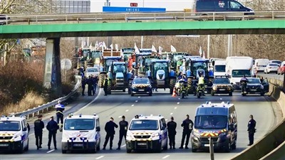 警察与浩浩荡荡围攻巴黎的拖拉机大军对峙