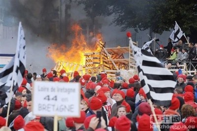 [5] “红帽”(the bonnets rouges)——2013年,法国布列塔尼(Brittany)针对一项新的高速公路税举行了一系列(主要是农村)的抗议活动。戴着红帽的示威者认为,这项税收对布列塔尼的农业有害。