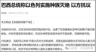 2月18日,正在非洲访问的巴西总统卢拉在接受采访时表示,在加沙地带发生的冲突并不是战争,而是种族灭绝。