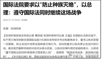 在1月26日,联合国国际法院发布初步判决,要求以色列采取一切措施,防止在加沙地带出现种族灭绝行为,但没有要求以色列停止在加沙的行动