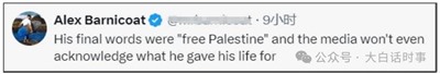 X平台上有个点赞超过3万的热评,直接说“他生命最后一句话是‘解放巴勒斯坦’,媒体甚至不会报道他为什么献出了生命”。