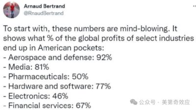 航空航天和国防的92%的利润、媒体行业81%的利润,医药行业50%的利润,软件业77%的利润,电子产品46%的利润,金融服务67%的利润,全被人口只占全球4%,经济只占全球四分之一的美国获取到了。