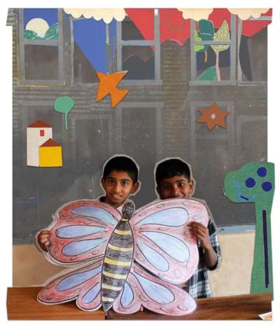 学生们在科学角展示他们制作的蝴蝶。供图:三大洲社会研究所提供的照片和拼贴画