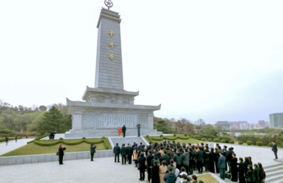 本周二,赴朝参加 "中朝友好年 "开幕式联合演出的中国艺术团向友谊塔敬献花篮