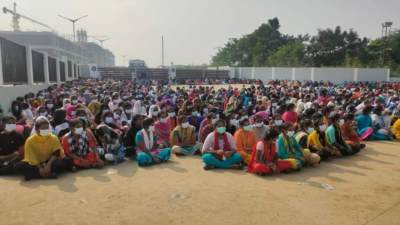 ▲2021年12月,印度泰米尔纳德邦,当地富士康iPhone组装厂的数千名年轻女工封锁了附近高速公路,抗议因工厂宿舍食物中毒导致数百名工人住院,要求政府改善她们的工作生活条件。