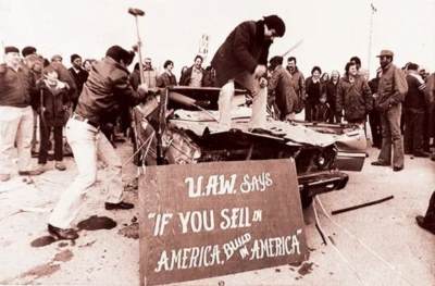 ▲1981年3月,全美汽车工人联合工会砸毁日本汽车,标语写着“如果你想在美国卖,就得在美国造”。