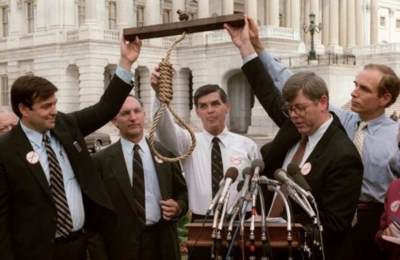 ▲1987年7月,为指责日本向苏联出售精密机床,美国保守派联盟在国会山向东芝颁发了“金绳奖”,寓意出自列宁的话,即资本家是如此的贪婪,以至于他们会卖给任何人上吊的绳子。