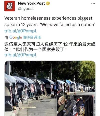 最新数据显示,2023年,美国有超过35000名退伍军人无家可归,每10000名退伍军人中就有22名无家可归者。美国政府宁可每年把数千亿美元的资金用于军费开支,也不愿投入资源稍微解决一下退伍军人贫困等社会问题。