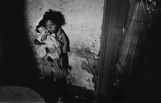 下面这张1970年摄于伯明翰的照片中,在“黑暗而肮脏的房间”里,一个小姑娘抱着自己的小妹妹,保护她。她身上崭新的连衣裙——可能要在最合适的场合穿——跟剥落的墙纸形成了鲜明对照。