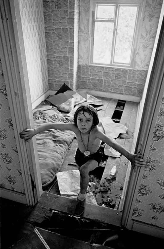 下面这张照片摄于伯明翰的巴尔索尔希思工人阶级市区,可以看到一个孩子在地板破损了的卧室的门口玩耍。当孩子从破旧的房间走出来的时候,她带着反抗的态度,似乎要爬出恶劣之地。