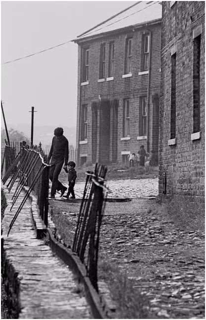 赫奇斯的一幅漂亮之作让人联想到索尔福德艺术家L·S·劳里(L. S Lowry)的一幅以英格兰西北部工业场景而闻名的绘画。照片拍的是西约克郡布拉德福德的烟雾笼罩的排屋街上。父亲牵着孩子。面部看不清,主宰前景的折断的栏杆映衬着他瘦削的身影。