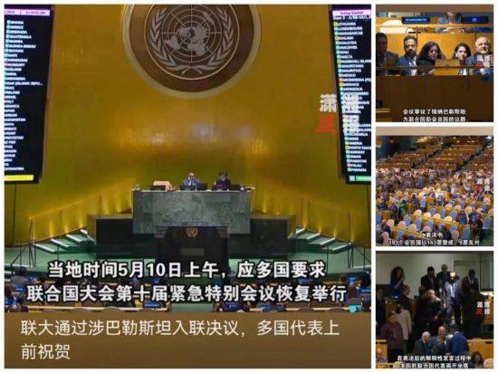 当地时间5月10日,应多国要求,联合国大会第十届紧急特别会议恢复举行。会议审议了接纳巴勒斯坦为联合国新会员国议题,通过了授予巴勒斯坦更多权利的决议。该决议除了重申巴勒斯坦人民的自决权,包括建立独立巴勒斯坦国的权利,以及“两国方案”等内容外,还确认巴勒斯坦符合《联合国宪章》规定的会员国资格,建议安理会以此重新审议巴勒斯坦递交的“入联”申请。