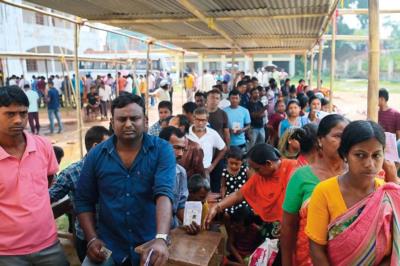 4月19日,在印度特里普拉邦阿加尔塔拉,人们在一处投票站参加投票 新华社发