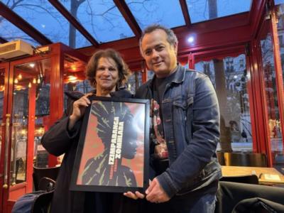 2024年,维杰·普拉沙德在法国巴黎向弗朗茨·法农的女儿米雷耶·法农·门德斯-弗朗茨赠送她父亲的经典著作《全世界受苦的人》(The Wretched of the Earth)最新祖鲁语版封面海报
