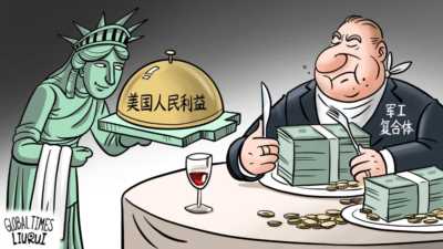 ▲美国军工复合体已成为一个毒瘤,不仅危害世界,也严重侵蚀美国民众的利益。(漫画丨刘蕊)