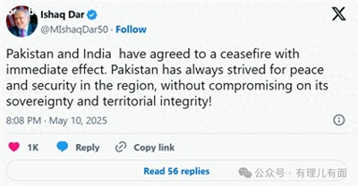 而就在双方宣布停火协议这个档口,懂王“敏锐”地看到了往脸上贴金的机会。他在“X”平台上发文表示,经过美国主持的漫长一夜的谈判,印度和巴基斯坦已达成立即生效的全面停火协议。他还补充说:“恭喜两国都能运用明智的判断力和卓越的智慧。”