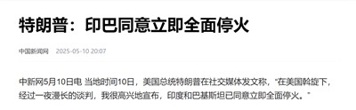 “在美国斡旋下,经过一夜漫长的谈判,我很高兴地宣布,印度和巴基斯坦已同意立即全面停火。”