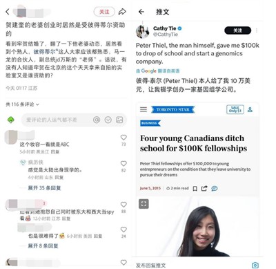 而最近贺建奎的新妻子,英文名字叫cathy tie,是个移民了加拿大的华人,她因为曾经接受过彼得蒂尔的资助开办一家基因组学公司而引起网友的关注与联想。不过笔者倒是觉得没什么必要,这位女士创建的基因组学公司已经处于某种查无此人的状态,并没有做出什么成果,连新闻都没有几条。笔者觉得她的情况更类似创业热潮里捧出来的某些创业明星,一切都是为了炒作,孙宇晨孙割的女友,当年不也是创业明星吗?cathy tie女士可能和彼得蒂尔并没有什么私交,但是她和贺建奎搞在一起,对于欧美的创业圈子无疑是极有吸引力的。