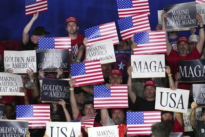 ▲2025年4月,新政府上任百天庆祝集会上,狂热支持者打出美国国旗和MAGA标语。