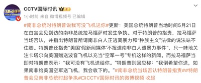美国总统特朗普当地时间5月21日在白宫会见到访的南非总统拉马福萨时发生争执。对于特朗普的指责,拉马福萨当场否认,并指出特朗普所谓南非白人正逃离暴力和“种族主义”法律的说法站不住脚。特朗普还指责“美国‘假新闻媒体’不报道南非白人遭暴力事件”,只一味地关注卡塔尔向美国赠送波音飞机以充当“空军一号”专机这样的新闻。而拉马福萨当即对特朗普表示:“我可没有飞机送给你。”特朗普则回应称:“我倒希望你送,如果南非给美国空军送飞机,我会收下的。”