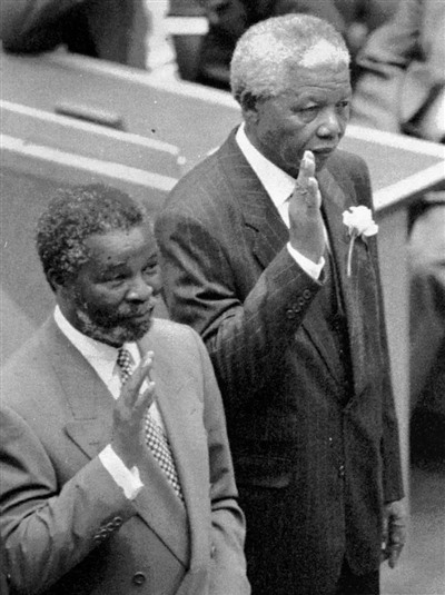 1994年5月9日,纳尔逊·曼德拉(右)在南非首次多种族大选中当选为南非历史上第一位黑人总统。新华社发