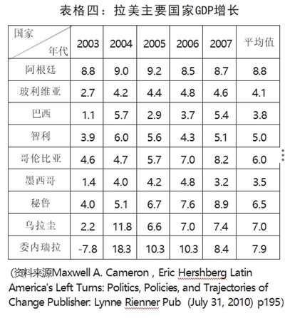 从表格四中近几年拉美各个主要国家的经济生产总值来看,由于秘鲁的左翼总统2011年才上台, 同时哥伦比亚和墨西哥为传统右翼政党执政的国家,因此这三个国家并不在拉美左翼政权之列。其它左翼政府领导下的拉美国家大都取得了不错的经济成绩,特别要指出的是由于2002年石油价格危机使得委内瑞拉经济生产总值达到了-7.8%,但仅仅一年之后委内瑞拉经济增长持续走高,其平均值甚至可以高居九国第二;更值得一提的是2001年阿根廷刚刚从金融危机的困境中走出,2003年-2007年阿根廷在前左翼总统基什内尔的带领下经济生产总值甚至冠绝这九个拉美国家之首;巴西作为拉丁美洲国家的主要经济体由于受2002年经济危机影响最为严重,其增长缓慢也情有可言,而玻利维亚由于贫困人口居多,其经济基础差,因此其经济增长的幅度不大。即使在这种情况下巴西与玻利维亚的平均值均仍然高于墨西哥的年均经济生产增长总值。