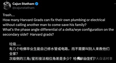 比如,现在美国网络舆论也有大量声援特朗普的MAGA声音,在各种嘲讽哈佛毕业生,比如嘲讽哈佛毕业生不会修水管、电路,也不会修车