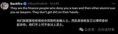 还有就是说哈佛毕业生是拒绝给“你”贷款的金融人士、以律师身份起诉“你”。