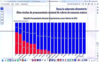 图中有红蓝两种颜色的条状图,红色部分是进口农产品比例,蓝色部分则是实现本国生产自给自足的比例。目前,委内瑞拉大部分农产品实现了自给自足,包括咖啡、鸡、鸡蛋、牛肉、盐、玉米和番茄酱;而牛奶(32%)、糖(37%)、意大利面(42%)、金枪鱼(69%)是需要进口的。