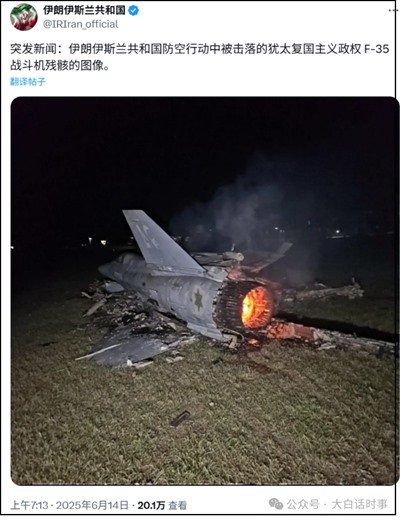 这个图源还标注着:伊朗伊斯兰共和国官方账号14日在社交平台X上公布被击落的以色列F-35战机残骸照。