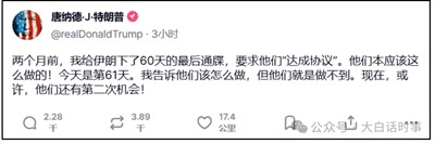看到伊朗如此拉胯,特朗普连忙出来“邀功”,说他两个月前给伊朗下了60天最后通牒,要求伊朗达成协议,否则就要打击伊朗。