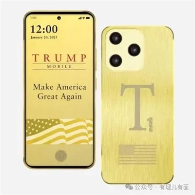 这张金色智能手机图片中,背景图显示“TRUMP MOBILE Make America Great Again”,翻译过来就是“让美国再次伟大的特朗普手机”,而手机背面则清晰的印着“T1”字样。