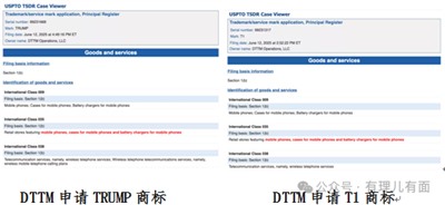 为了将具有自主品牌的“The 47 Plan”和“T1”智能手机计划落到实处,上周,特朗普集团旗下的DTTM Operations LLC公司已申请将“TRUMP”和“T1”用于电信、移动配件和手机本身,向美国专利商标局提交专利申请,涵盖无线电话服务、手机、手机壳和充电器,以及销售所有这些服务的零售店。从商标覆盖范围看,直指手机制造、零售店布局,甚至可能推出特朗普定制版5G设备。