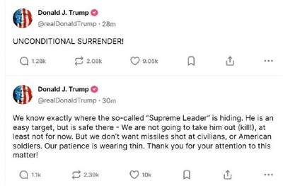 我们确切地知道所谓的“最高领袖”躲藏在哪里。 他(哈梅内伊)很容易成为目标,但在那里很安全——我们不会把他带出去(杀死!),至少现在不会。 但我们不希望用导弹向平民或美国士兵发射。 我们的耐心正在耗尽。 感谢您对此事的关注!”
