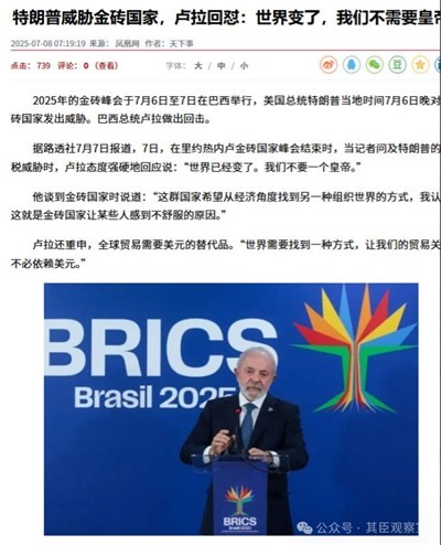 美元体系的动摇,恰是特朗普这类保守政客最敏感的神经痛点。卢拉以战略家的眼光,用最简洁的语言揭穿了西方主导秩序的最大软肋,这种四两拨千斤的智慧,正是新兴经济体在国际舞台日渐成熟的生动写照。