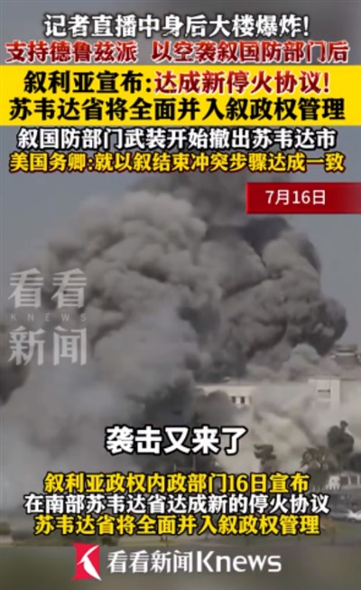7月16日,以色列也宣布介入事态。以色列军方表示,为了保护苏韦达德鲁兹人的安全自治权,他们对大马士革的叙利亚军事总部以及苏韦达附近地区进行了空袭,旨在阻止叙利亚政府军向苏韦达增援。