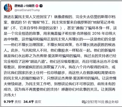 结果特朗普在7月13日就发了一篇很长的小作文,力挺邦迪,说爱泼斯坦案名单是民主党人炮制的,还说不要在爱泼斯坦身上浪费时间和精力,那个没人关心的人。