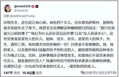 该留言称:“总统先生,这句话让我心碎。我有四个女儿,住在德克萨斯州,那里有很多家庭失去了孩子。我甚至无法理解这种颠倒黑白的说法:“那已经是很久以前的事了”“我们为什么还在谈论这件事”以及“没人应该关心”。这些受害者是某些人的女儿、姐妹、侄女、孙女。是某些人的孩子。先生,请您三思。我投票支持您所做的一切!我们都指望您能将这种变态行为绳之以法。我谨对您信守的所有承诺表示敬意和感激。也请您让这一次也成为受害者的代言人。~爱您和您的家人。”