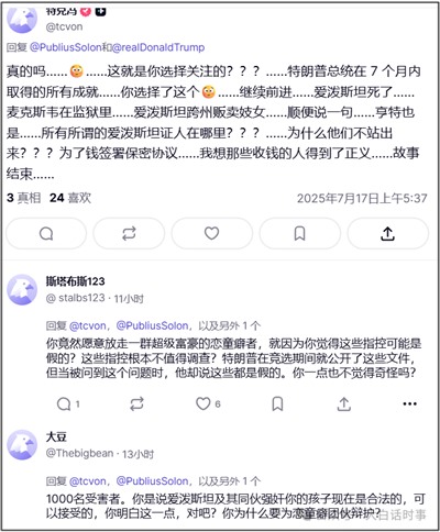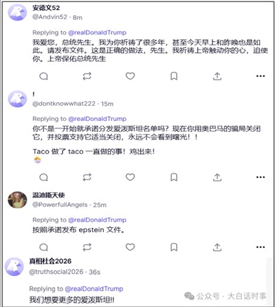 如果把特朗普这个帖子的评论区,按热度排序,我看了前几十个留言,全都是在批评特朗普,但用词会稍微礼貌一些,有的甚至会在批评特朗普不公开爱泼斯坦名单的同时,仍然会说“爱您”“尊重”“谢谢”,是被特朗普PUA到深处了,有一种“虽然你背叛了我,但我仍然爱你”的感觉。