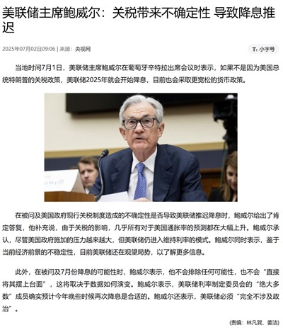 7月1日,鲍威尔在葡萄牙出席会议时公开表示,如果不是因为美国总统特朗普的关税政策,那美联储早就降息了,没降息的原因全部是因为特朗普搞的关税战。