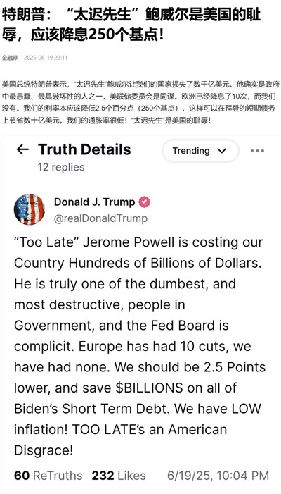 到了6月份,特朗普忍不住了,体面不要了,开始公然攻击鲍威尔,称鲍威尔是“太迟先生”,说鲍威尔是美国政府中最愚蠢,最具破坏性的人,美国利率本应该和欧洲一样降息了250个基点,但因为太迟先生所以这一切都没有发生。
