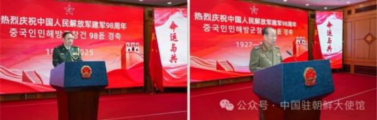 2025年7月22日,中国驻朝鲜使馆举行庆祝中国人民解放军建军98周年招待会。中国驻朝鲜大使王亚军、冯春台公使、王宜胜少将国防武官等使馆外交官,朝鲜国防省副相金刚日中将、党中央国际部副部长文成革、总政治局副局长朴永日中将、海军副司令官金成哲少将、空军副司令官崔光植少将、外务省副相朴明浩、社会安全省副相金成南、外交团事业局总局长金益晟等朝党政军各部门负责人及各界代表,驻朝外交使节、武官团代表,中国人民志愿军烈士褒扬代表处、在朝中资机构、媒体、旅朝华侨、留学生代表等近150人出席。王宜胜武官和朴永日副局长分别致辞。