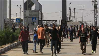 2023年 11 月 3 日,数千名被以色列驱逐的巴勒斯坦工人在加沙拉法返回加沙地带。以色列军队在距离边境口岸 2 公里处留下的工人步行进入加沙。以色列当局没收了所有工人的钱和手机。(阿贝德·拉希姆·哈提卜摄 - 安纳多卢通讯社)